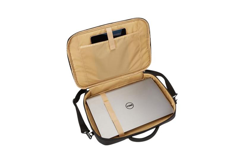 Tasken er en sort, vandafvisende notebooktaske med polstret indvendig skum, fremstillet af polyester og PE‑skum. Den måler 42 cm i bredden, 7 cm i dybden og 31 cm i højden og vejer 730 g. Indvendigt kan den rumme en bærbar computer på op til 15,6 tommer (maks. 39,6 cm) samt en tablet på op til 12 tommer. Eksternt findes en lynlåslukket frontpoche til personlige genstande, mens interne netlommer giver plads til kabler og tilbehør. Med aftagelig skulderrem, polstret greb, drejekrog og bagagerem kan tasken bæres på skulderen, i hånden eller fastgøres i bagagen.