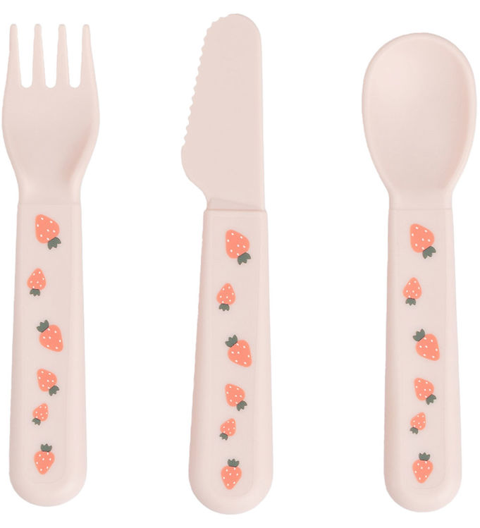 Bestiksættet består af en gaffel, kniv og ske fremstillet af fødevaregodkendt polypropylen (PP), som er BPA‑fri og genanvendeligt. Alle dele har bløde, afrundede kanter, der gør dem egnede til børns små hænder. Sættet kan anvendes i mikrobølgeovn og tåler opvaskemaskine, så det er praktisk i hverdagen. Farven er en lys puddernuance med et jordbærmotiv, der tilføjer et legende udtryk og farverigt til måltidet.
