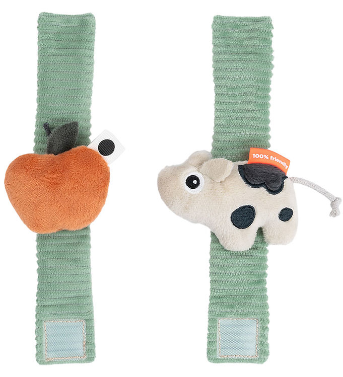 Dette håndledsranglesæt indeholder to små rangler i grøn farve, designet til nyfødte og spædbørn fra 0 + måned. Den ene rangle har en figurform, den anden en æbleform, og begge er udstyret med ringlede elementer, knitrelyd og varierede teksturer, der stimulerer barnets hørelse og taktile sans. Overfladen er prydet med kontrastfarvede prikker, striber og farverige dele, som understøtter visuel opmærksomhed og hjælper barnet med at genkende sine hænder. Ranglerne kan fastgøres sikkert omkring håndled eller ankler for nem adgang under leg og sensorisk udforskning.