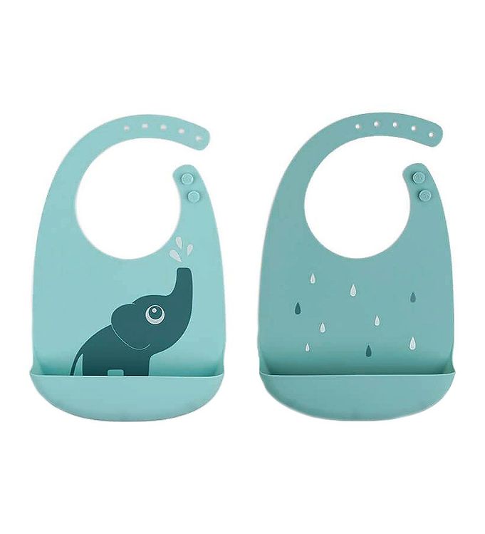 Done by Deer Elphee Blue Hagesmæk 2-pak er konstrueret i silikone. Hver hagesmæk er designet med forskellige motiver – en med et elefantmønster og en med regndråber. Hver hagesmæk er udstyret med en lomme til opsamling af spildt mad. Længden er justerbar i nakken, og hagesmækken lukkes med en simpel krog i nakken. Silikonematerialet er let rengørligt og modstandsdygtigt over for milde kemikalier. Designet er enkelt og funktionelt, og de to hagesmække giver mulighed for at have en klar.