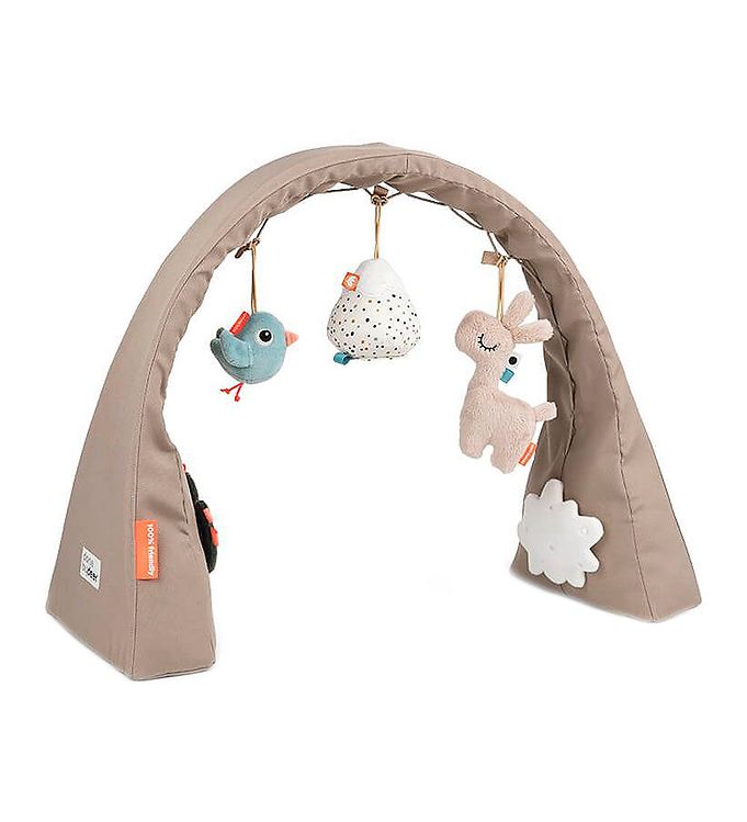 - Aktivitetslegetøj langs ryggen stimulerer barnets bevægelse på maven.