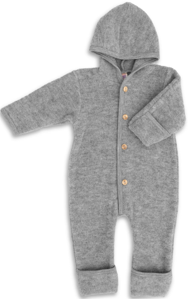 Køredragten er fremstillet af 100 % økologisk uld og har en fast hætte, som beskytter hovedet mod vind og kulde. Fronten lukkes med fine træknapper, der giver en stabil lukning uden metal. Dragten har lange ærmer og ben, hvor både hånd- og fodåbningerne er udstyret med ombuk og smalle ribkanter, så den kan justeres efter behov. Uldens naturlige isolering og åndbarhed holder kroppen varm i kolde udendørsforhold, mens materialet er blødt mod huden. Den fås i farven Cinnamon Mélange (rød) med farvekode 079E i flere størrelser, så den kan tilpasses lille, normal og stor kropsbygning.