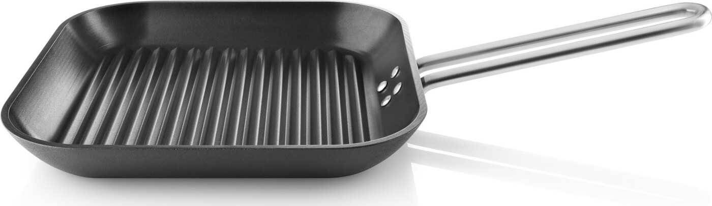 Grillstegepanden har en firkantet form på 28 × 28 cm og en 10 mm tyk bund af 85 % genanvendt aluminium, som sikrer jævn varmefordeling og modstand mod temperaturer op til 400 °C. Den keramiske non‑stick belægning giver grillstriber samtidig med at fedt og saft løber fra maden. Panden er kompatibel med alle varmekilder, herunder induktion, og vejer 2,0 kg. Den samlede højde er 9 cm, hvilket giver god plads til mad. Den kan anvendes i opvaskemaskine, men håndvask anbefales for at bevare belægningens egenskaber.