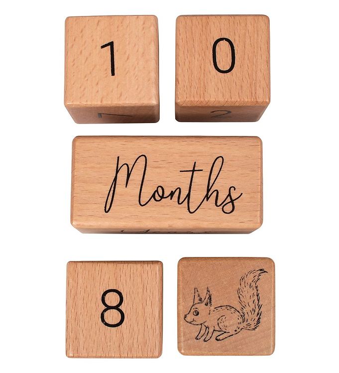 Dette sæt indeholder fem naturlige træklodser – én stor og fire små – med trykte tal fra 0 til 9 samt ordene days, weeks, months og years. Klodserne er beige, har afrundede hjørner for at beskytte små hænder og måler 8 × 4 × 4 cm for den store og 4 × 4 × 4 cm for de små. De kan anvendes til at introducere tal og tidsbegreber for børn fra 12 mdr. til 5 år, samt som dekorativt tilbehør på børneværelset eller i billeder.