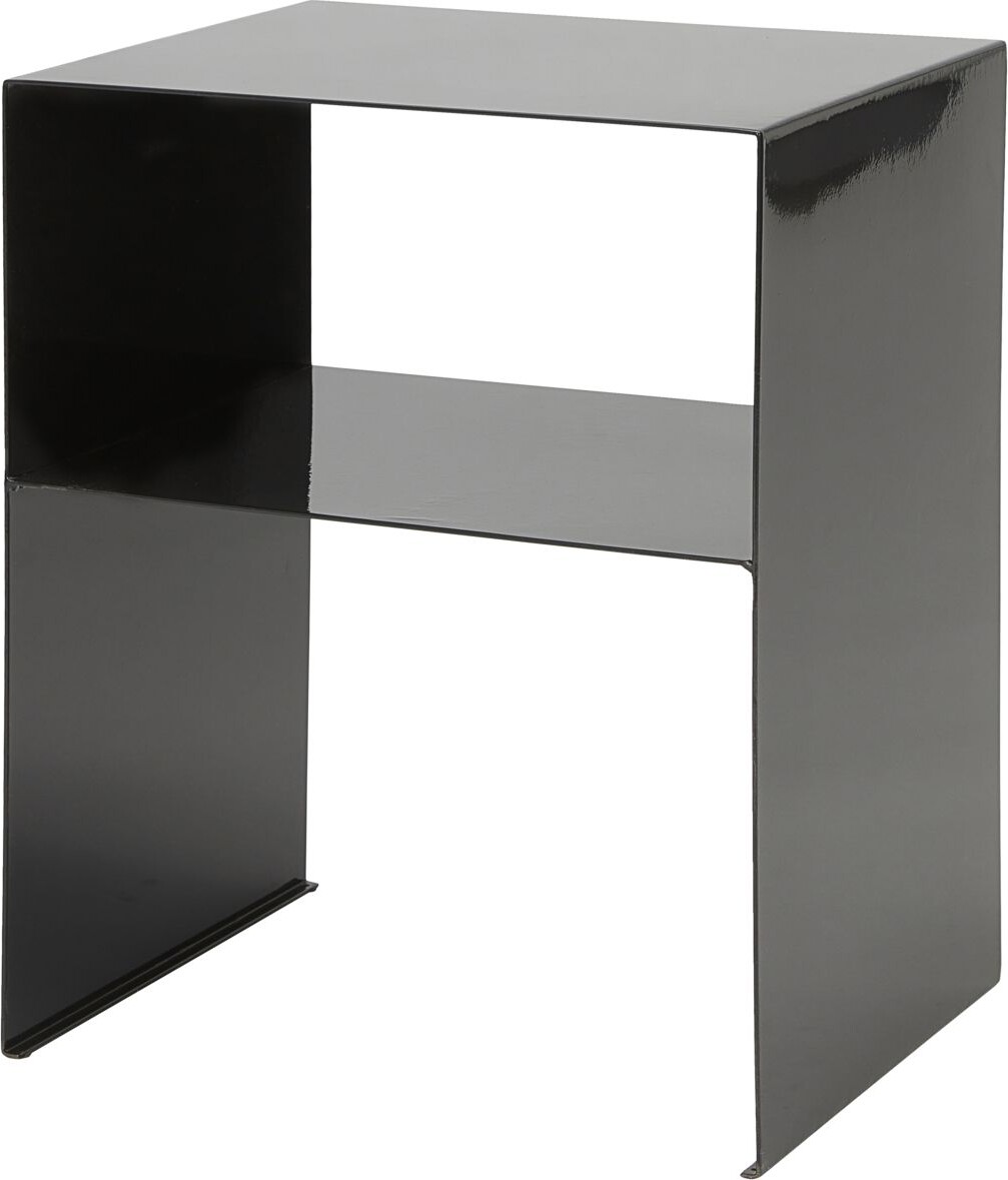 Sidebordet er konstrueret af stål med en sort, skinnende finish og et clean‑cut design, der giver et industrielt og minimalistisk udtryk. Målene er 40 cm i længde, 50 cm i højde og 32 cm i bredde, og bordet vejer 11,24 kg med en maksimal belastning på 8 kg. Det er beregnet til placering ved siden af sofaen, fx med en bordlampe på toppen og magasiner på den nederste hylde. Overfladen er glat og kan tørres af med en fugtig klud; vaskemidler bør undgås.