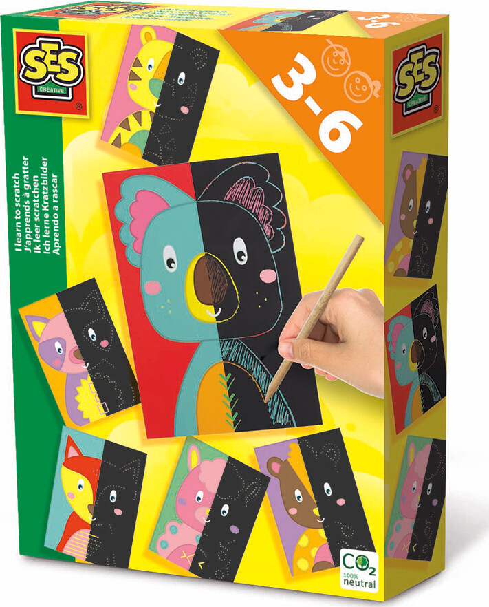 Jeg Lærer at Scratche er et kreativt scratch‑sæt bestående af seks dyr på individuelle papirkort, hver udstyret med en farvebelægning, der kan fjernes med den medfølgende plastpen. Kortene indeholder støttelinker, der guider børnenes bevægelser og hjælper med at holde farvelægningen inden for de afgrænsede områder. Sættet er CE‑godkendt og beregnet til børn fra tre år, og det kombinerer papir og plast som primære materialer.