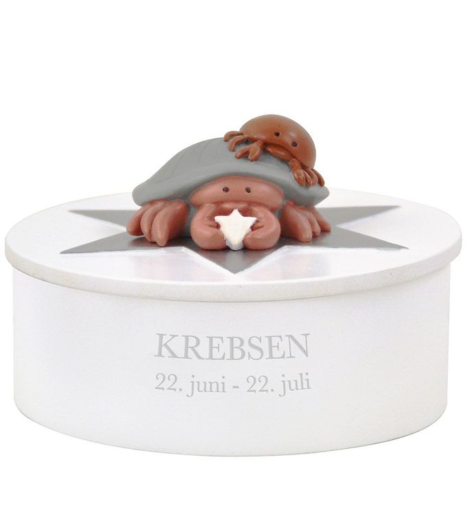 Det hvide smykkeskrin har et aftageligt låg, der åbner til et indre rum udstyret med en aftagelig skillevæg, så skrinet kan opdeles i to separate sektioner. Både indersiden og ydersiden af bunden er beklædt med filt for ekstra beskyttelse af smykkerne. På lågets forside er der en figur, der holder en lysende stjerne, samt teksten “KREBSEN” og stjernetegnets periode. Skrinet er håndlavet, måler 4 × 11 cm uden låg og er beregnet til børn fra 3 til 10+ år.