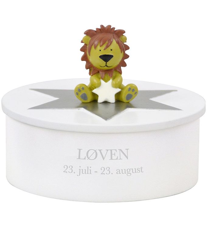 Dette smykkeskrin er designet til børn og har en løvemotiv på låget, hvor løven holder en selvlysende stjerne, der lyser i mørket. Skrinet måler 15 × 15 × 14 cm inkl. låg og vejer 0,45 kg. Indvendigt er det foret med blød filt og indeholder et aftageligt plexiglasskillerum til adskillede smykker. Låget kan åbnes og lukkes, og der kan påføres permanent lasergravering med navn, fødselsdato eller kort besked i grå farve. Produktet er ikke ment som legetøj.