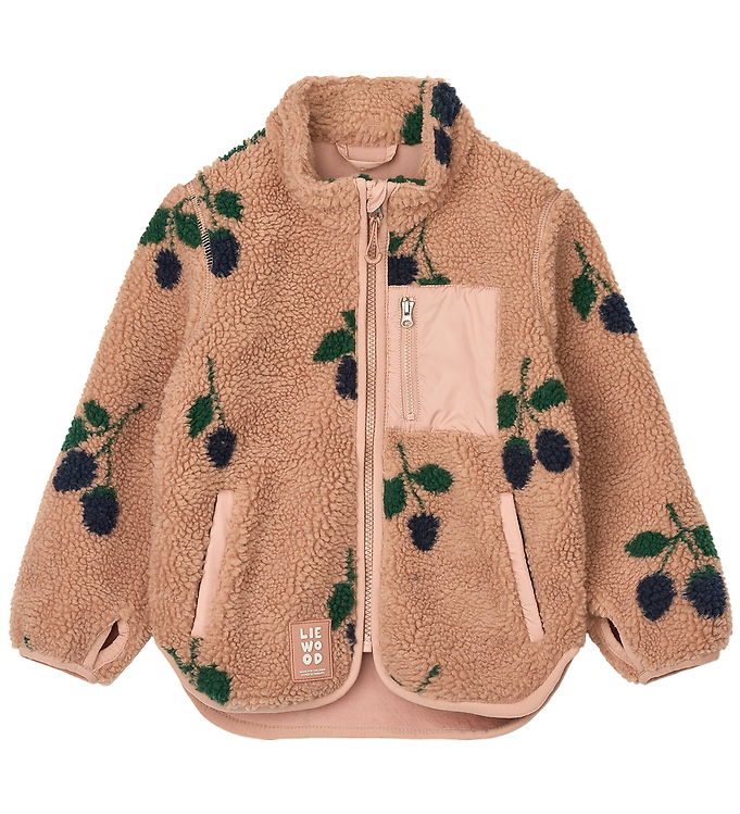 Pilejakke i teddyfleece med stort bærprint på en lys terracotta‑baggrund. Jakken har høj hals, smalle kanter og et lille hul til tommelfingeren, hvilket giver ekstra bevægelsesfrihed. Lukkes med lynlås udstyret med hagebeskytter og indvendig vindstolpe for ekstra beskyttelse mod vind. Siderne er udstyret med praktiske lommer, mens fronten har en brystlomme med lodret lynlås. Materialet er 100 % genanvendt polyester, kraftigt, blødt og let strækbart, velegnet til lag-på-lag på kølige dage. Vedligeholdes ved 30 °C og er certificeret efter Oeko‑tex og GRS.