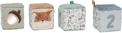 Little Dutch Plysterninger 4 stk Forest Friends er et sæt med fire bløde terninger, hver med farverige skovmotiver og forskellige sensoriske elementer såsom knitrende lydposer, strukturerede teksturer, klistermærker, fløjlsbløde paneler og et lille spejl. Terningerne måler 8 × 8 × 8 cm, er fremstillet af en ydre blanding af 90 % polyester og 10 % bomuld med 100 % polyesterfyld, og er beregnet til børn fra fødsel (0 m+). De små dimensioner og bløde overflade gør dem nemme at gribe, mens de varierede lyde og overflader fremmer hånd‑øje‑koordination og sensorisk udforskning. Designet med farverige motiver fra skovens dyr giver terningerne både visuel og taktil stimulation, og de kan håndvaskes ved 30 °C.