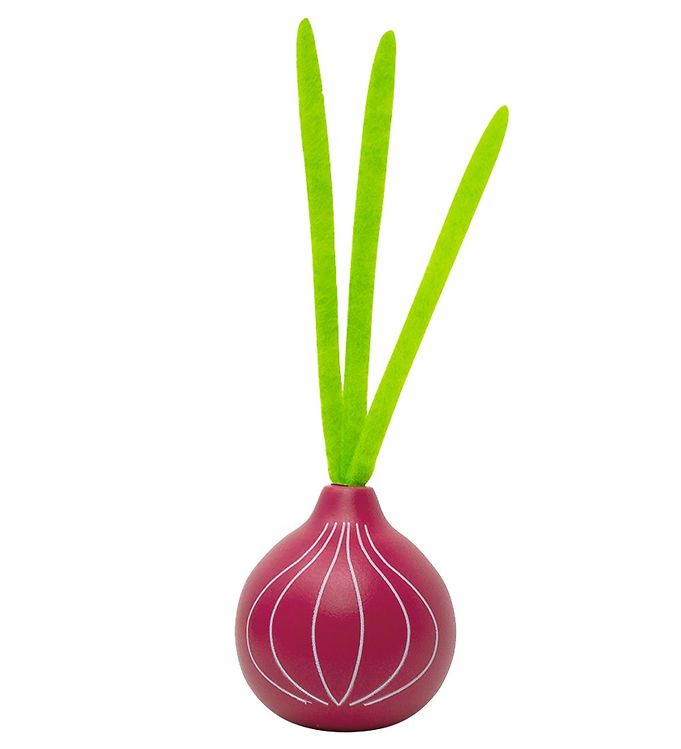 Legemad i træ er formet som et rødløg med top og giver børn mulighed for at efterligne madlavning i rolleleg. Figuren er udskåret af naturligt træ, slibet for at undgå skarpe kanter og bevarer en naturlig træfarve med røde detaljer, som fremhæver løgets udseende. Den lette konstruktion passer til små hænder, så barnet kan holde og manipulere legetøjet uden besvær. Produktet kan kombineres med andet trælegetøj for udvidet fantasileg.