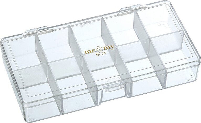 Den kompakte opbevaringsæske er fremstillet af klar akryl og måler 18 cm i længden, 9 cm i bredden og 3 cm i dybden. Indvendigt er den opdelt i ti separate rum, som gør den velegnet til organisering af smykker, perler, små værktøjer eller andre små genstande. Låget er trykt med et diskret guldfarvet logo, som giver et stilrent udseende. Produktet leveres uden indhold og er egnet til børn fra 6 år og opefter.