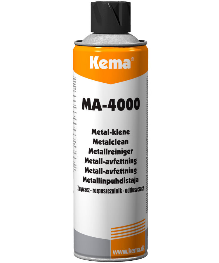 Metal‑Klene MA‑4000 er en industriel affedtningsspray i aerosol på 500 ml, klassificeret som brandfarlig (klasse 2.1) med UN‑nummer 1950. Den opløser hurtigt olie, fedt, voks, tjære, asfalt, fernisser, silikoner og harpikser uden at beskadige metal, glas, murværk, gummi eller de fleste plasttyper. Sprayen fordamper hurtigt, efterlader en ren, tør overflade og kan anvendes som forbehandlingsvæske før limning med cyanoakrylater eller anaerobe lim.