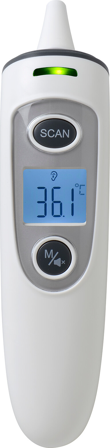 Det hvide digitale øre‑ og pandetermometer kan måle kropstemperatur både i øret og på panden samt overfladetemperatur på mad, badevand og andre genstande. Ørefunktionen aktiveres ved at fjerne den beskyttende hætte, mens hætten på giver kontaktløs måling på panden, også på sovende børn. En‑knaps betjening muliggør skift mellem Celsius og Fahrenheit, og en trefarvet indikator viser normal, let og høj temperatur. Måling udføres på én sekund med en nøjagtighed på ±0,2 °C og en hukommelse på 35 målinger.