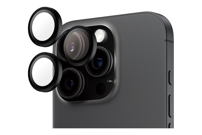 PanzerGlass Hoops™ Black Lens Protector er et 2,6 mm tykt hærdet glasdesignet til kameraobjektivet på iPhone 16 Pro og iPhone 16 Pro Max. Glasset måler 42,5 mm i bredden og 44,7 mm i højden, vejer 5 g og leveres i sort. En silikonebelægning gør overfladen fedtafvisende, mens afrundede kanter forhindrer direkte kontakt med hænder. Installation foregår med fuld klæbemiddel, der giver en boblefri påføring og kan fjernes igen uden restmateriale. Produktet indeholder rengøringsklud samt tør‑ og vådservietter til forberedelse og vedligeholdelse.