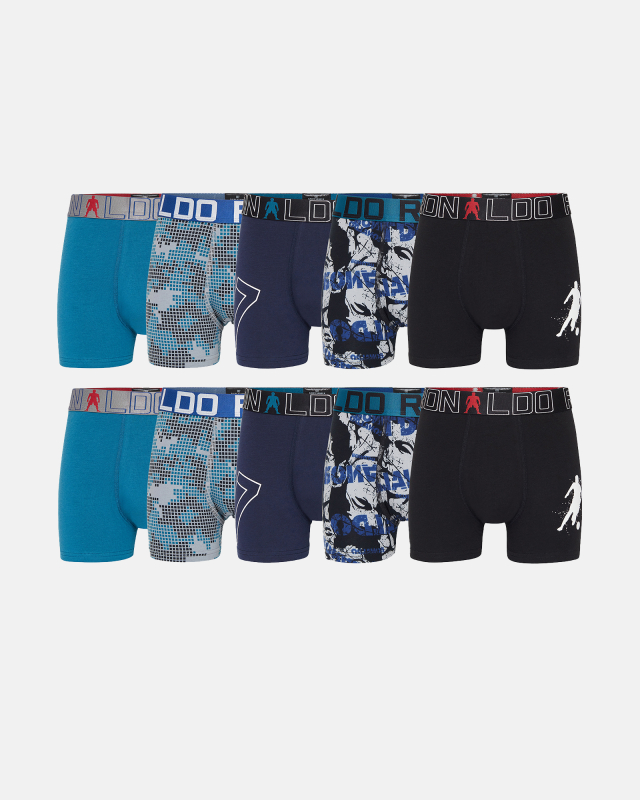 Dette sæt indeholder to par drengeundertøj i sort, fremstillet af en blød bomuldsblanding bestående af 95 % bomuld og 5 % elastan. Den elastiske linning sikrer tæt, men fleksibel pasform, mens det moderne snit giver støtte og fri bevægelse ved daglig aktivitet eller sport. Overfladen er trykt med et logo, der tilføjer et grafisk element uden at påvirke funktionaliteten. Produktet er beregnet til børn i alderen fire til seks år.