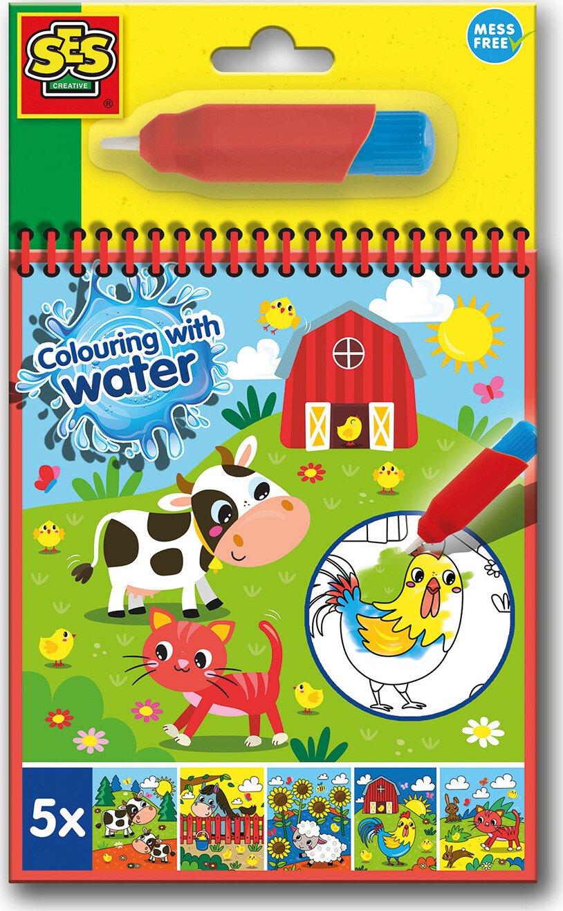 Malebogen har fem enkeltstående sider med bondegårdstema, hvor hvert motiv kan frembringes ved at påføre vand på de trykte farvefelter. Vandet aktiverer en farvepigment, så billedet fremkommer uden brug af farveblyanter eller pensler. Bogen er udformet i et format, der er let for små hænder at håndtere, og siderne er perforerede for nem udtrækning. Produktet er CE‑mærket og angivet for aldersgruppen 3 til 7 år. Materialet er ikke specificeret, men siderne er beregnet til gentagen vandbaseret farvning.