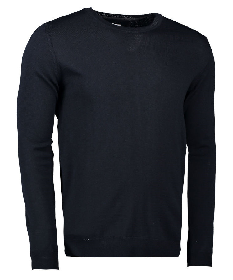 Puljeren er en navy-farvet striktrøje med en tæt, fitted pasform, der følger kroppens linjer uden at begrænse bevægelse. Garnet består af en 50 % merinould‑ og 50 % akrylblanding, som kombinerer naturlig isolering, åndbarhed og blødhed med akryls holdbarhed og farveægthed. Stoffet er let og varm, velegnet til kølige dage og kan bæres over skjorte eller under jakke. Trøjen har en rund halsudskæring, ribbet krave, ærmer og bund for holdbar pasform.