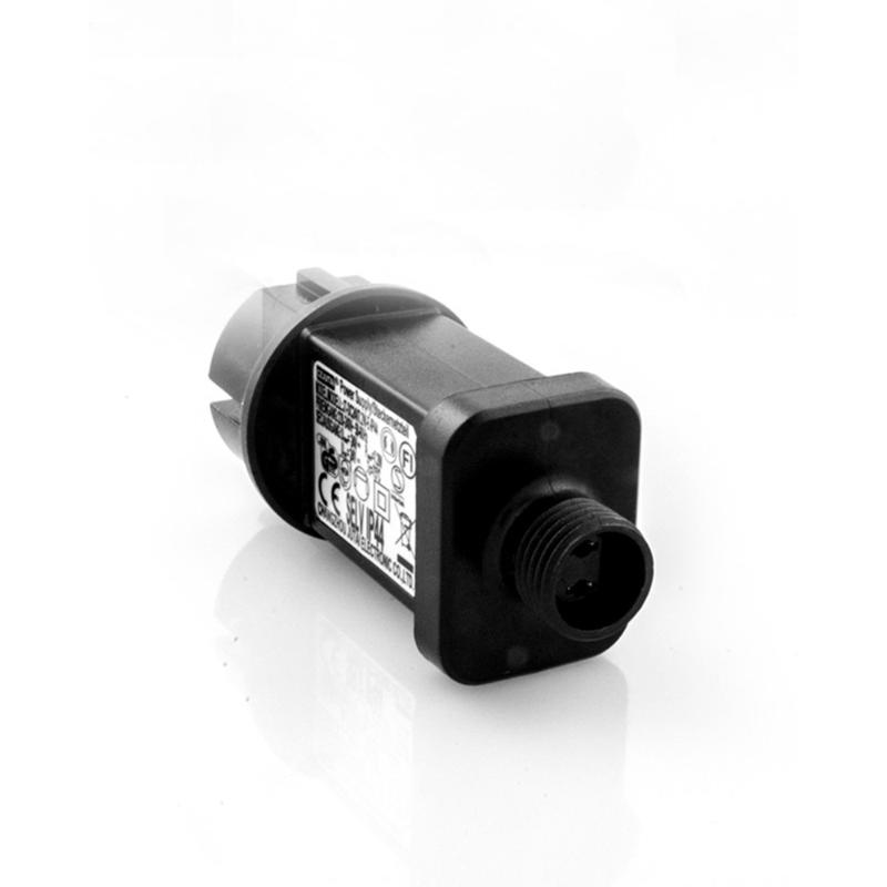 Transformeren er designet til udendørs lyskæder og muliggør ombygning af et forlængersæt til et startsæt eller udskiftning af en manglende enhed i et eksisterende opsæt. Den leverer 24 W ved 36 V fra en 230 V netforsyning og er indkapslet i en sort metal‑plastkonstruktion med målene 110 mm × 45 mm × 45 mm. Beskyttelsesklassen IP44 sikrer mod indtrængen af vand og faste partikler, mens den indbyggede timer giver valgmuligheder på 4, 6 eller 8 timer.