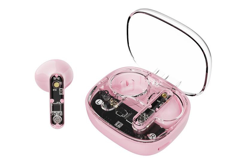 De trådløse TWS‑øretelefoner har et delvist gennemsigtigt pink design og er udstyret med Bluetooth 5.2 for stabil trådløs forbindelse. Hver øretelefon indeholder en indbygget mikrofon og trykknapper til håndtering af opkald og medieafspilning. En enkelt opladning giver op til fire timers afspilning, mens det medfølgende USB‑C‑opladningsetui forlænger den samlede spilletid til ti timer. En ergonomisk pasform med håndledsrem sikrer sikker placering under aktivitet, og emballagen er FSC MIX, fremstillet af skovbaserede og genbrugsmaterialer.