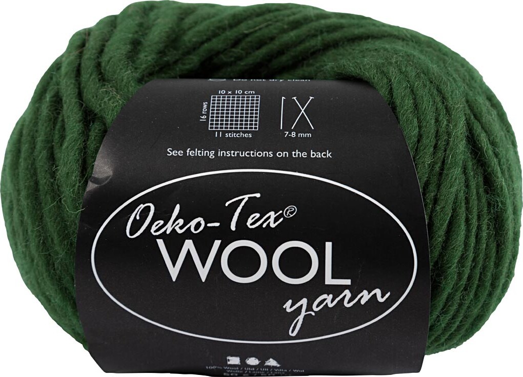 Uldgarn L50M Grøn 50 g er et 100 % uldgarn på 50 m, vejet 50 g, beregnet til strikning, fingerstrik, hækling, chunky‑vævning og pomponering. Garnet har en anbefalet nålestørrelse omkring 8 mm og kan håndvaskes med uldsæbe ved temperaturer under 50 °C eller maskinvaskes, hvor det kan filtes og let krympe. Efter vask bør det tørres fladt og formes efter ønsket. Garnet er fremstillet med miljøhensyn og opfylder en anerkendt tekstilstandard.