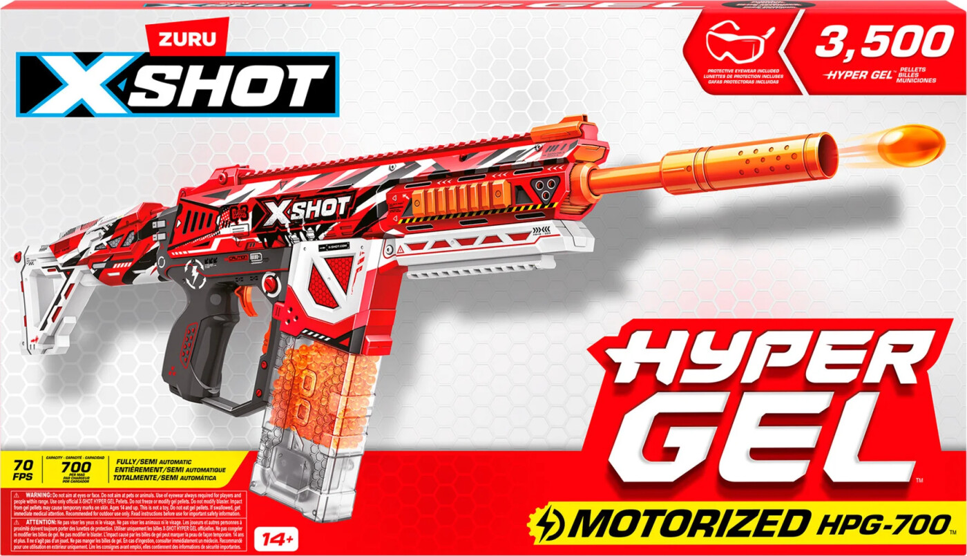 Den motoriserede large blaster er en fuld‑/semi‑automatisk gel‑blaster, der skyder gelkugler med en udgangshastighed på ca. 70 FPS. Den drives af et genopladeligt batteri og har et magasin på 700 kugler. Pakken indeholder 3500 gelkugler samt beskyttelsesbriller. Enheden er CE‑mærket og er beregnet til udendørs leg for børn fra 10 år og opefter. Den har en rød/orange farve og leveres i én størrelse. Den ergonomiske greb og balancerede vægtfordeling giver god kontrol ved hurtig skydning.